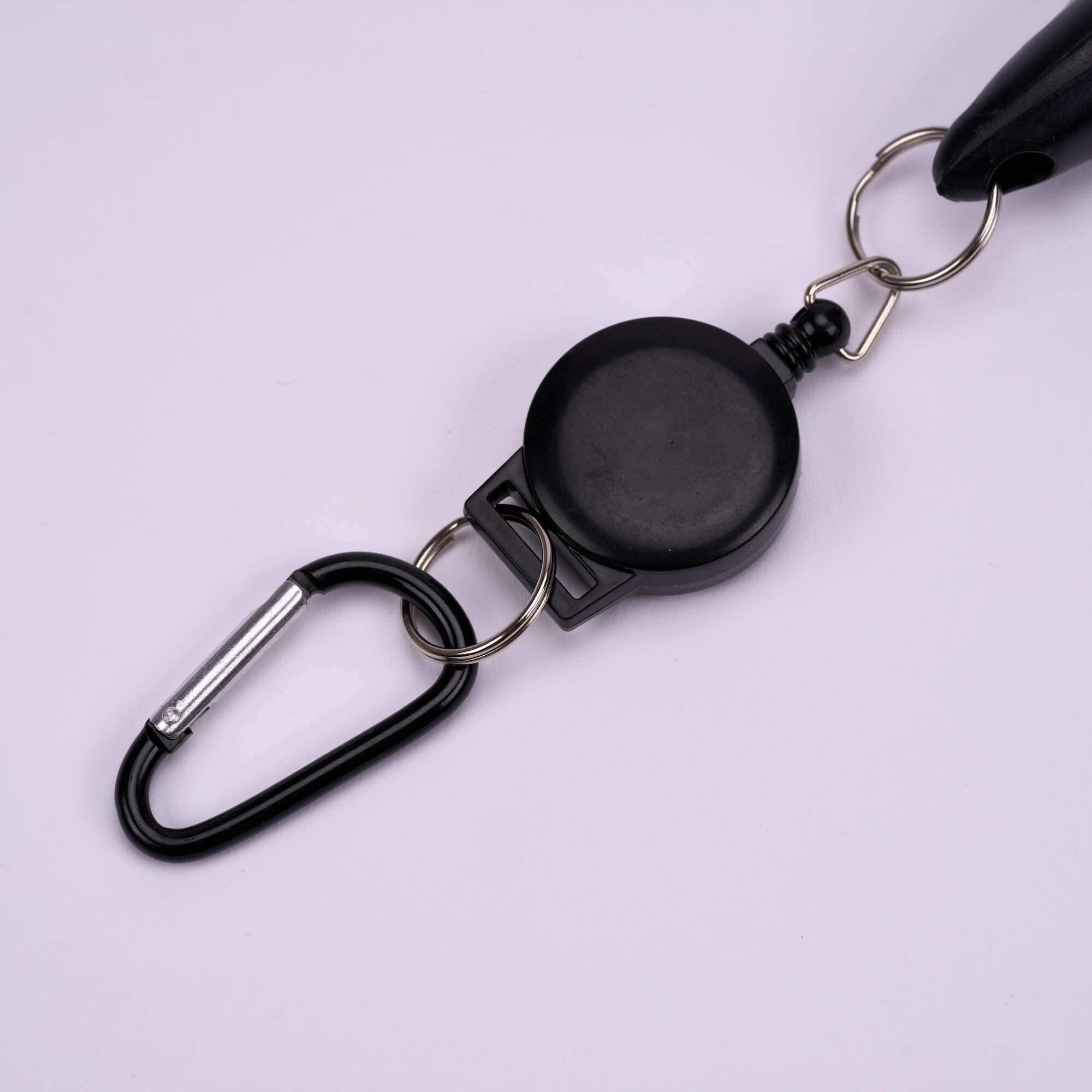 - Clip-on retractor with 16" of cord and Carabiner for bag attachment.